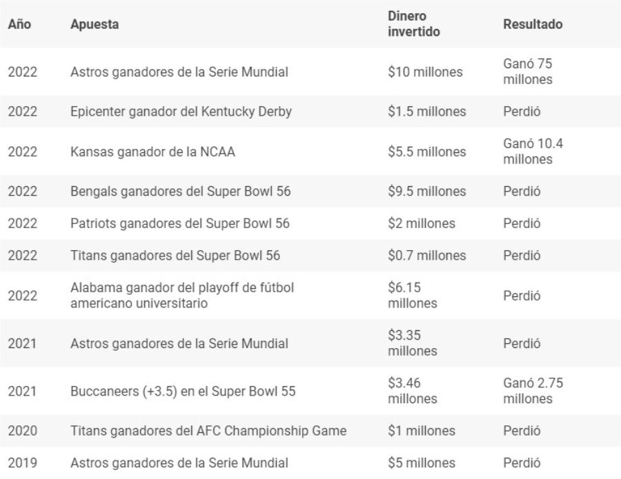 La ya mencionada apuesta de 10 millones de dólares por los Astros es la más lucrativa, pero no es la más grande de la historia de Mattress Mack. En febrero, invirtió 9.5 millones de dólares en los Bengals contra Los Angeles Rams, con la posibilidad de ganar 16.2 millones, pero los californianos arruinaron su fiesta. Anteriormente, había invertido en los mismos Astros en 2019, pero perdió 13 millones de dólares en esa oportunidad.